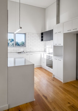 In plan the ‘box’ is notched to both major facades. Sizeable Generous voids are cut out of the rear of the building mass providing all bedrooms direct access to natural light and ventilation. The location of the kitchen on the front elevation recognises the significance of this space. The corner kitchen window connects north facing external areas and provides direct access to natural light and ventilation. The semi-contained nature of the kitchen prevents it from dominating the living space.