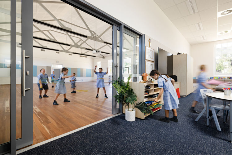 A shade structure and planters with integrated seating offer a sheltered break space, blurring the lines between outside and inside the adjacent hall. The underutilised Parish Hall now contains dedicated contemporary OSHC facilities and church meeting rooms, along with central flexible-use space, kitchen and amenities shared by the school, OSHC and Parish. The local heritage listed building has had unsympathetic additions removed to reinstate original style windows and exposed truss ceiling.