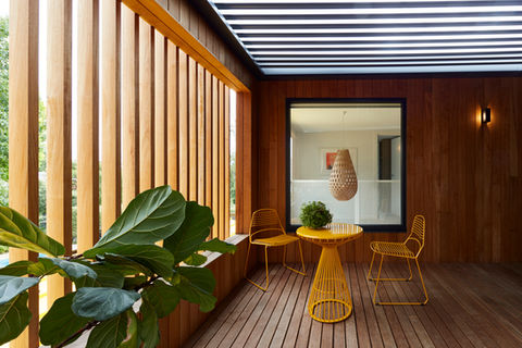 Tucked behind the typical single storey façade of an eastern suburbs’ bungalow is the delightful two storey design of House 108. With extensive external timber cladding, large windows and strong connections to outdoor areas, House 108 feels more like a New Zealand cabin than an inner-city Adelaide house.