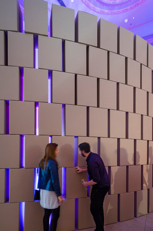 The low-cost, lightweight but structurally strong materials were also selected to achieve the scale, impact and flexibility of construction required for each location, but ultimately for its ability to be completely reused as packaging by the JamFactory, after being dismantled. Similarly, both installations appeared temporary in nature but solid as enclosures within a larger volume, while visual transparency deliberately created by the openings between the boxes or through horizontally stacked tubes, drew people into and around the space to invite a sense of discovery and engagement with the works on display.