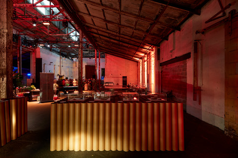 In the second year, we worked collaboratively with JamFactory’s furniture designers throughout the design process to successfully pre-fabricate the cylinders into modules that would provide visual precision and transparency, save time during the construction, and also be adaptable to suit any interior location beyond the typical reduced lifespan inherent within temporary installations.
